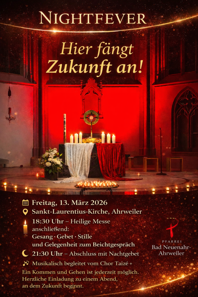 Unter dem Motto der diesjährigen MISEREOR-Fastenaktion „Hier fängt Zukunft an!“ lädt die Pfarrei Bad Neuenahr-Ahrweiler am Freitag, 13. März 2026, zu einem besonderen Nightfever-Abend in die Sankt-Laurentius-Kirche nach Ahrweiler ein.