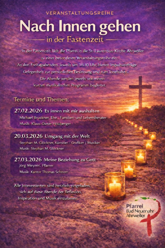 Bad Neuenahr-Ahrweiler – In der Fastenzeit lädt die Pfarrei Bad Neuenahr-Ahrweiler zu einer besonderen Veranstaltungsreihe in die St.-Laurentius-Kirche Ahrweiler ein. Unter dem Titel „Nach innen gehen“ finden an drei Freitagabenden Impulsvorträge statt, die Raum für persönliche Besinnung, Reflexion und Innehalten bieten. Jeder Abend wird von einem kurzen musikalischen Programm begleitet.