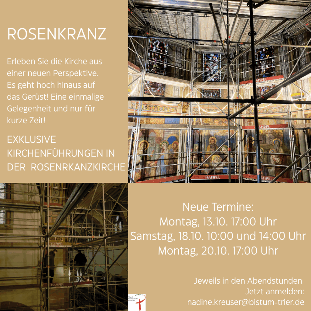 Pfarrei Bad Neuenahr-Ahrweiler Führungen in der Rosenkranzkirche starten Ab dem 6. Oktober 2025 eröffnet sich eine außergewöhnliche Gelegenheit: Die Rosenkranzkirche in Bad Neuenahr-Ahrweiler kann dank des derzeit errichteten Gerüsts aus […]