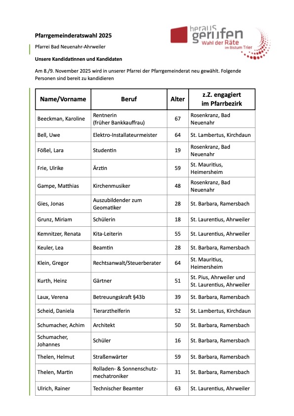 Pfarrei Bad Neuenahr-Ahrweiler Wahlaufruf zur Wahl der Räte im Bistum Trier „Mitreden! Der Zukunft eine Stimme geben.“ So lautet das Motto für die Wahl der Räte am 8./9. November 2025. […]